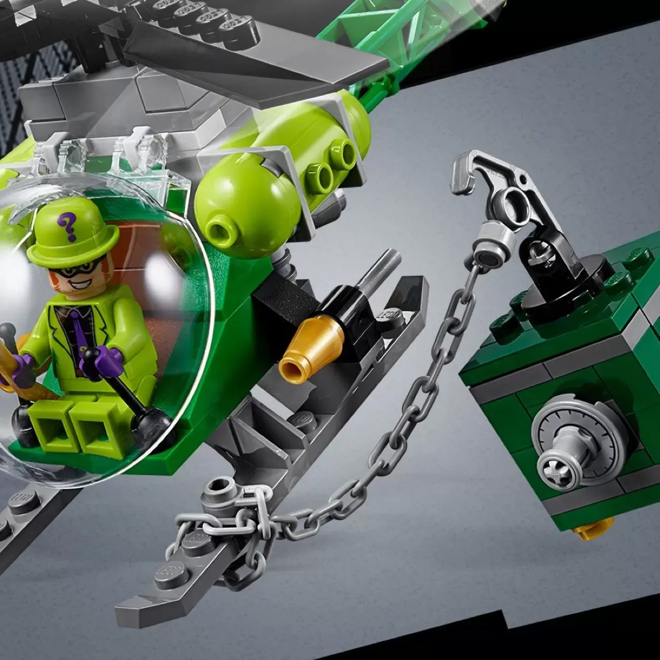 • The Riddler's helicopter has an opening minifigure cockpit, spinning rotors, 2 flick missiles and a chain with a hook to pick up the safe.