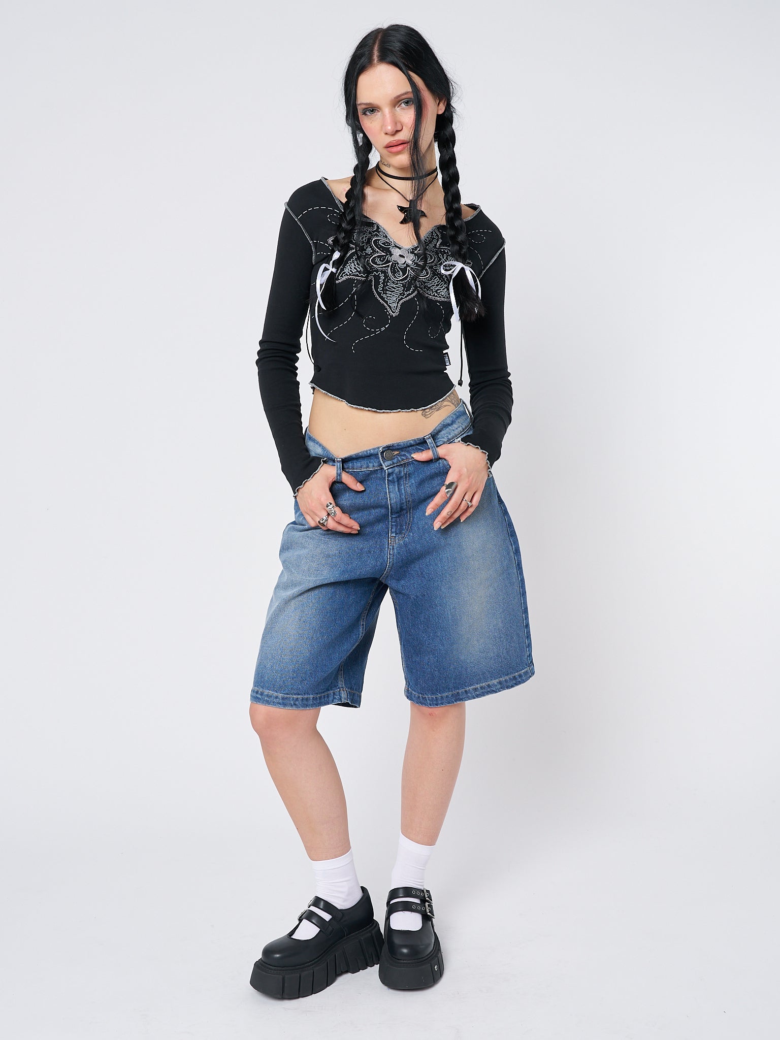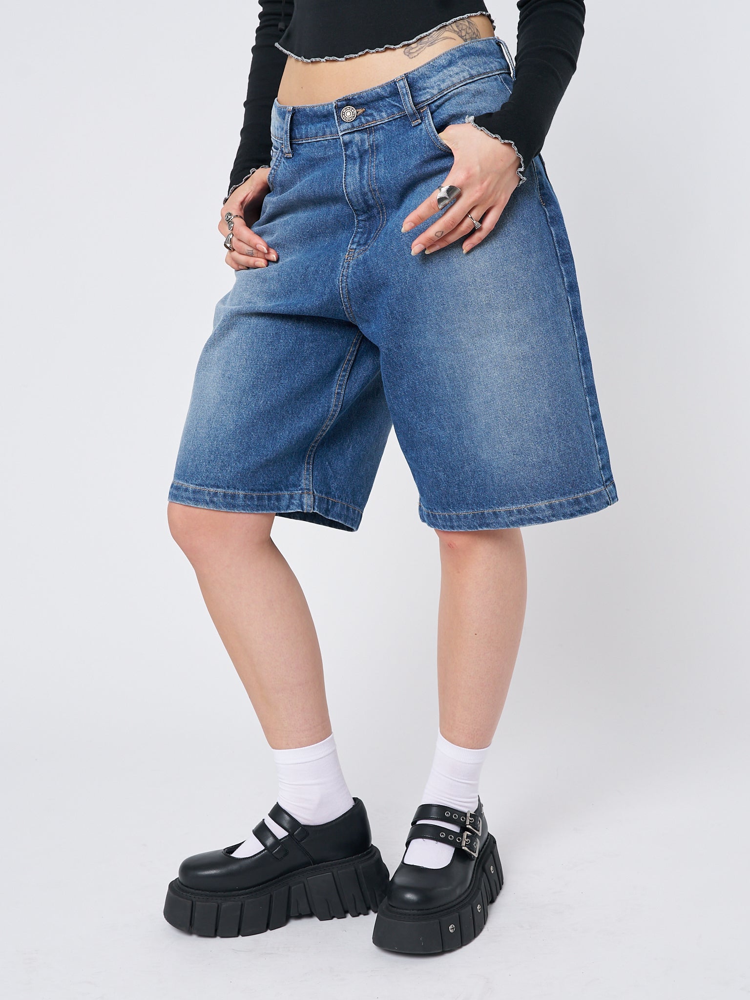 - Blue washed longline denim shorts